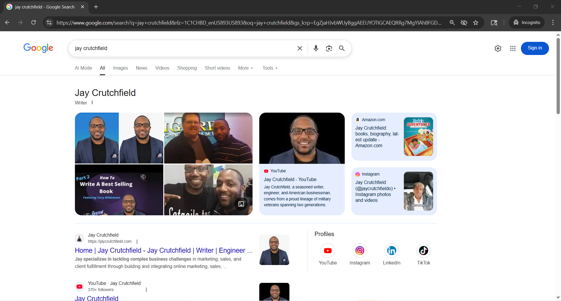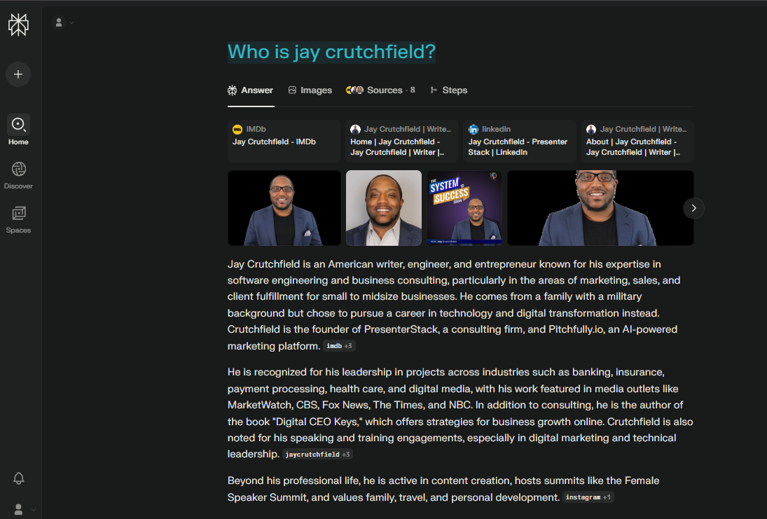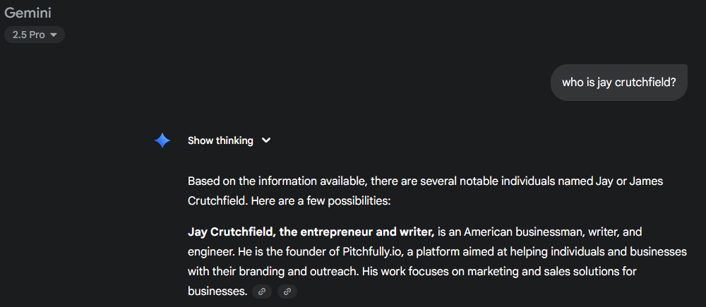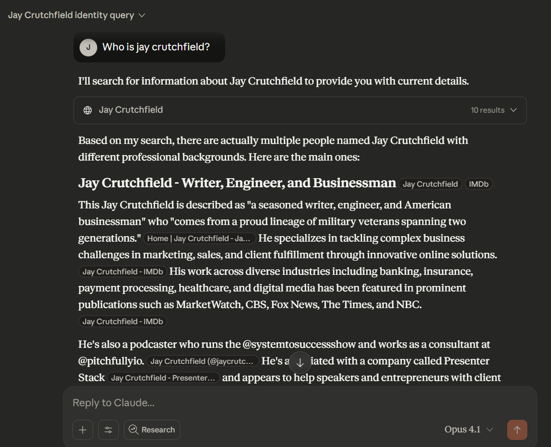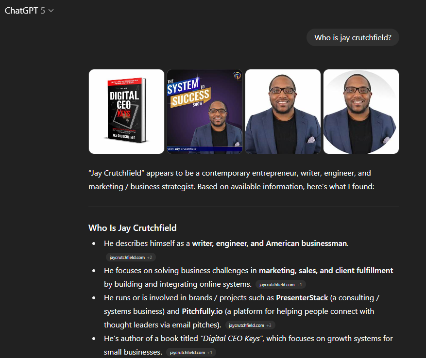 “Hey, I’m Jay Crutchfield, and I want to help you put your name in Google and AI Platforms to amplify your real-world credibility online. Click below so I can show you how.“